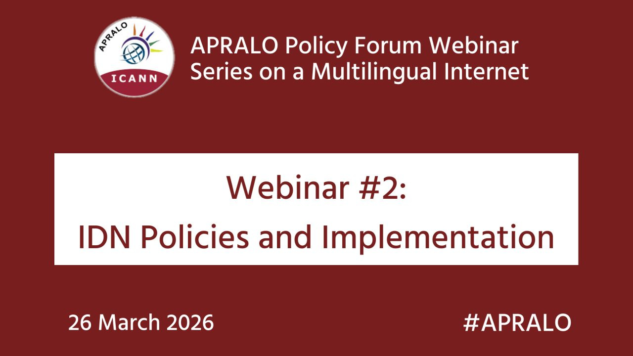 This second webinar in the APRALO Policy Forum series focused on Internationalized Domain Names (IDNs), examining both the extensive policy development work and the practical implementation mechanisms leading into the 2026 new gTLD round. The session emphasized that IDNs—while appearing straightforward—are underpinned by over a decade of complex, community-driven technical and policy work.